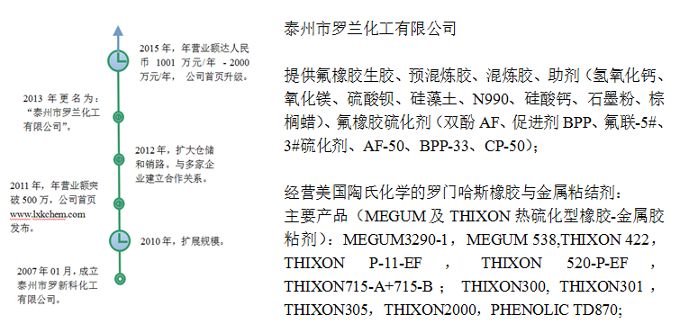 泰州市羅蘭化工有限公司向您提供氟橡膠生膠、預混煉膠、混煉膠、助劑(氫氧化鈣、氧化鎂、硫酸鋇、硅藻土、N990、硅酸鈣、石墨粉、棕櫚蠟)、氟橡膠硫化劑(雙酚AF、促進劑BPP、氟聯(lián)-5#、3#硫化劑、AF-50、BPP-33、CP-50);經(jīng)營美國陶氏化學的羅門哈斯橡膠與金屬粘結(jié)劑,主要產(chǎn)品(MEGUM及THIXON熱硫化型橡膠-金屬膠粘劑):MEGUM3290-1,MEGUM 538,THIXON 422,THIXON P-11-EF,THIXON 520-P-EF,THIXON715-A+715-B;THIXON300,THIXON301,THIXON305,THIXON2000,PHENOLIC TD870;